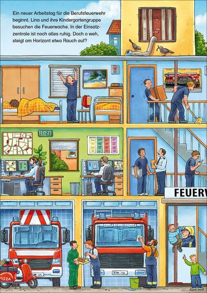 Bei der Feuerwehr geht es rund! In einer Wohnung ist ein Feuer ausgebrochen. Mit lautem Tatütata düsen die Feuerwehrleute zum Einsatzort. Die Drehleiter wird ausgefahren und der Brand mit dem großen Wasserschlauch gelöscht. Was die Feuerwehr wohl sonst noch macht? Und kannst du auch das kleine Spielzeug-Feuerwehrauto finden, das sich auf jeder Seite versteckt hat?
