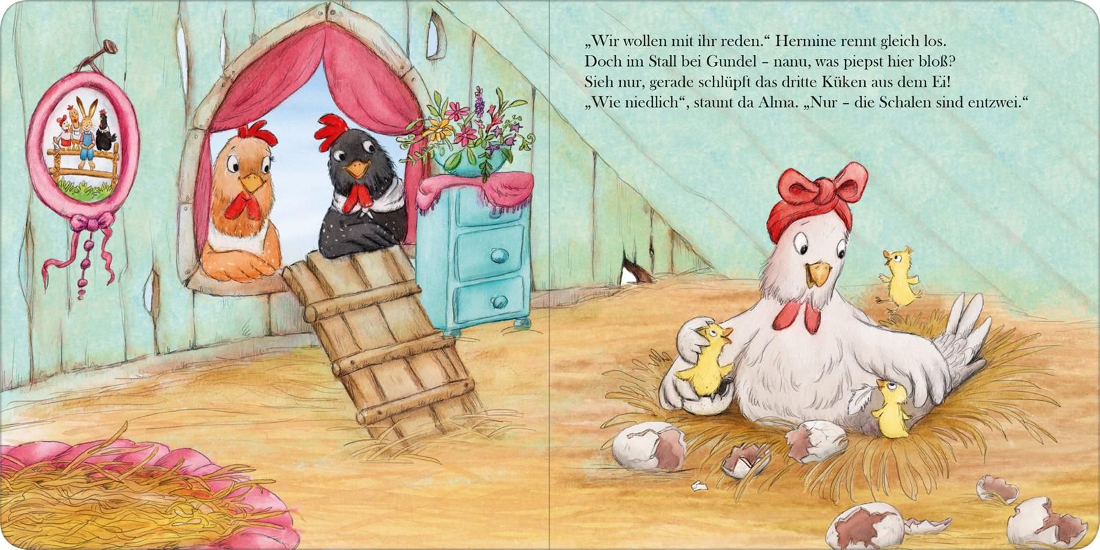 Auf dem Hühnerhof herrscht große Aufregung. Der Osterhase hat sich angekündigt, um seine Eierbestellung abzuholen. Doch es fehlen drei Eier! Was nun? Zum Glück haben Gundel, Alma und Hermine eine tolle Idee. Ostern ist gerettet!