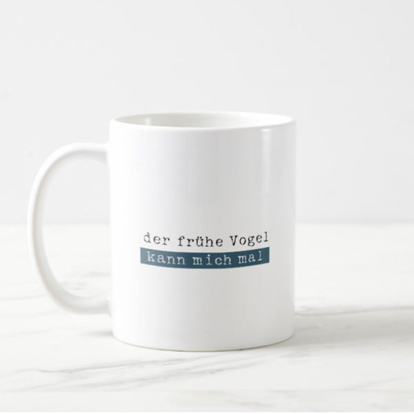 Tasse mit Beschriftung "Der frühe Vogel... kann mich mal!"