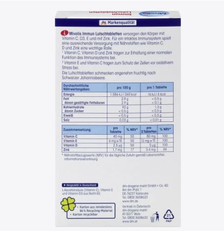 Las pastillas Mivolis Immune aportan al organismo vitamina C, D3, E y zinc. Un suministro adecuado de nutrientes como la vitamina C, D y el zinc desempeña un papel importante para un sistema inmunitario intacto. La vitamina C, la vitamina D y el zinc contribuyen a mantener el funcionamiento normal del sistema inmunitario. La vitamina E y la vitamina C contribuyen a la protección de las células contra el estrés oxidativo. Las pastillas tienen un agradable sabor afrutado a grosella negra.