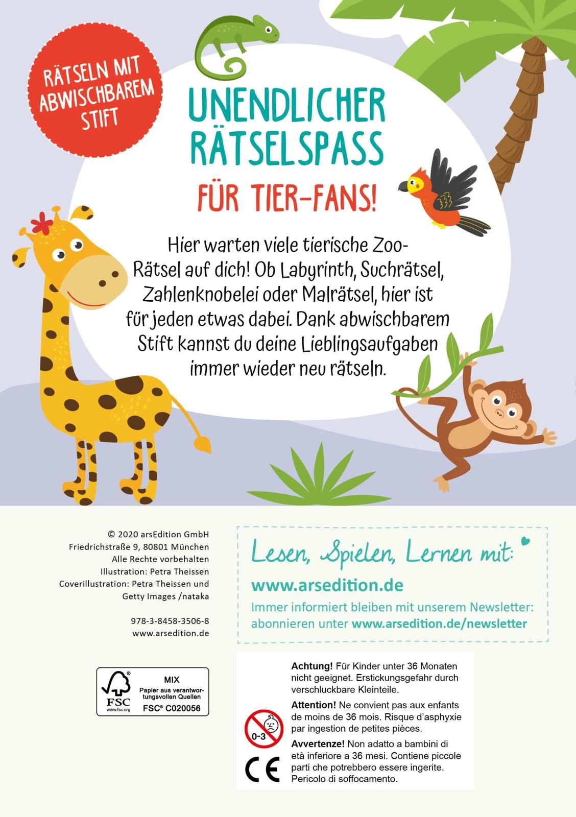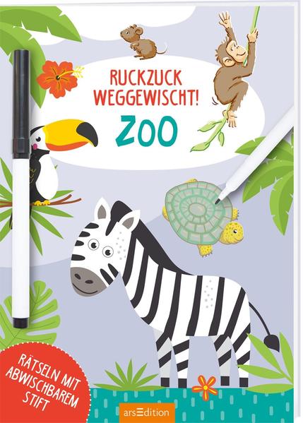 Dem Heft liegt ein abwischbarer Stift bei, mit dem die Kinder die niedlichen Rätsel rund um Löwe, Elefant & Co. immer wieder neu lösen können. Ist eine Lösung falsch, lässt sich die Tinte ganz ohne Wasser oder Reinigungsmittel nur mit einem Taschentuch entfernen – einfach ruckzuck weggewischt!