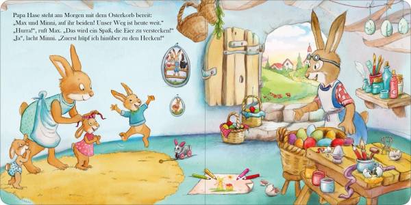 Vom Osterhasen empfohlen! Heute ist es endlich soweit: Max und Minni dürfen Papa Osterhase beim Ostereierverstecken helfen. Doch wohin mit all den bunten Eiern? Hinter die Hecken? Unter den alten Hut? Und dürfen Osterhasenkinder eigentlich auch Eier suchen? Eine lustige Ostergeschichte für die Allerkleinsten Wie jedes Jahr muss Papa Osterhase zum Osterfest die Ostereier verstecken. Doch dieses Jahr bekommt er Hilfe von seinen Hasenkindern Max und Minni. Dieses handliche erste Bilderbuch mit stabilen Pappseiten erzählt in lustigen Reimen eine erste Geschichte rund um das Thema Ostern. Die niedlichen Illustrationen und die glänzende Folie auf dem Buchcover machen das Pappbilderbuch zum perfekten Ostergeschenk für kleine Kinder ab 24 Monaten.